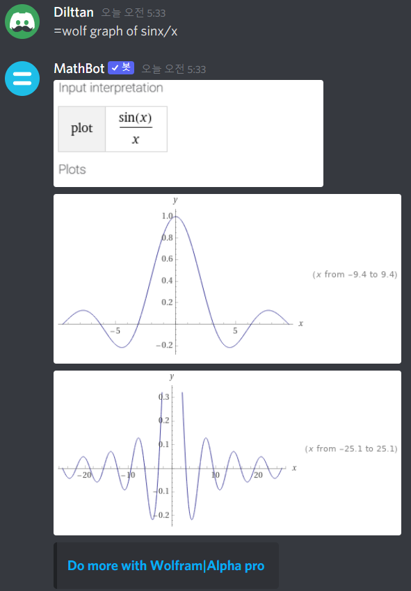 MathBot에서는 =wolf라 하고 뒤에 검색할 내용을 입력하면 울프럼 알파에서 검색한 내용을 보여줍니다. 위는 sinx/x의 그래프를 그린 예시입니다.