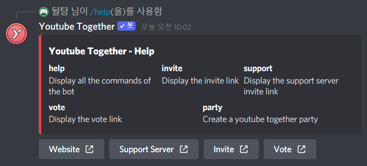 Youtube Together 봇은 이름 그대로 유튜브 투게더 기능을 이용할 수 있는 봇입니다. 유튜브 투게더는 디코에서 업데이트 예정인 기능으로 음성 채널에서 유튜브 동영상을 함께 볼 수 있는 기능입니다.
