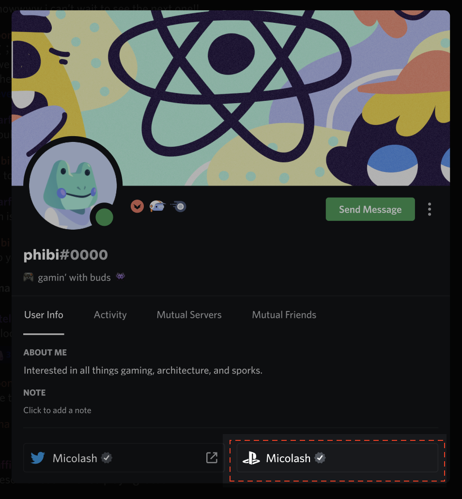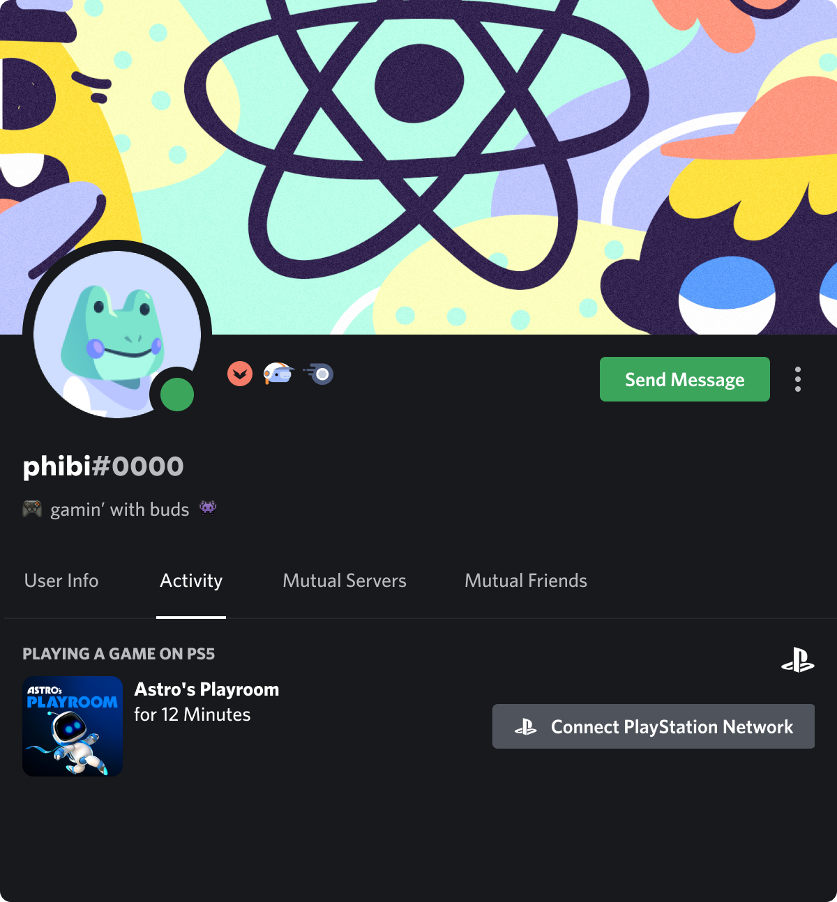 다음과 같이 프로필에 플레이스테이션 네트워크에서 무슨 활동을 하는지 보이게 됩니다. 기존 디스코드에서 게임을 하면 무슨 게임을 하는지 보이던 것처럼 말이죠. 어느 기종에서 플레이하고 있는지, 시작한 지 얼마나 지났는지 등의 정보도 뜨게 됩니다.