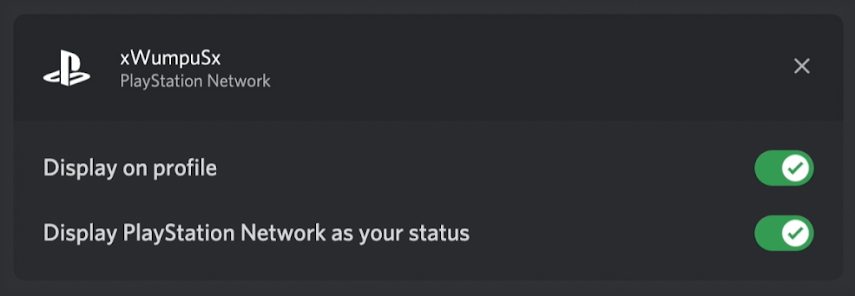 디스코드와 플레이스테이션 계정을 연결하시면 위처럼 크게 두 가지 기능이 있습니다. 이 기능들은 옆의 체크표시를 통해 끄거나 켤 수 있습니다.