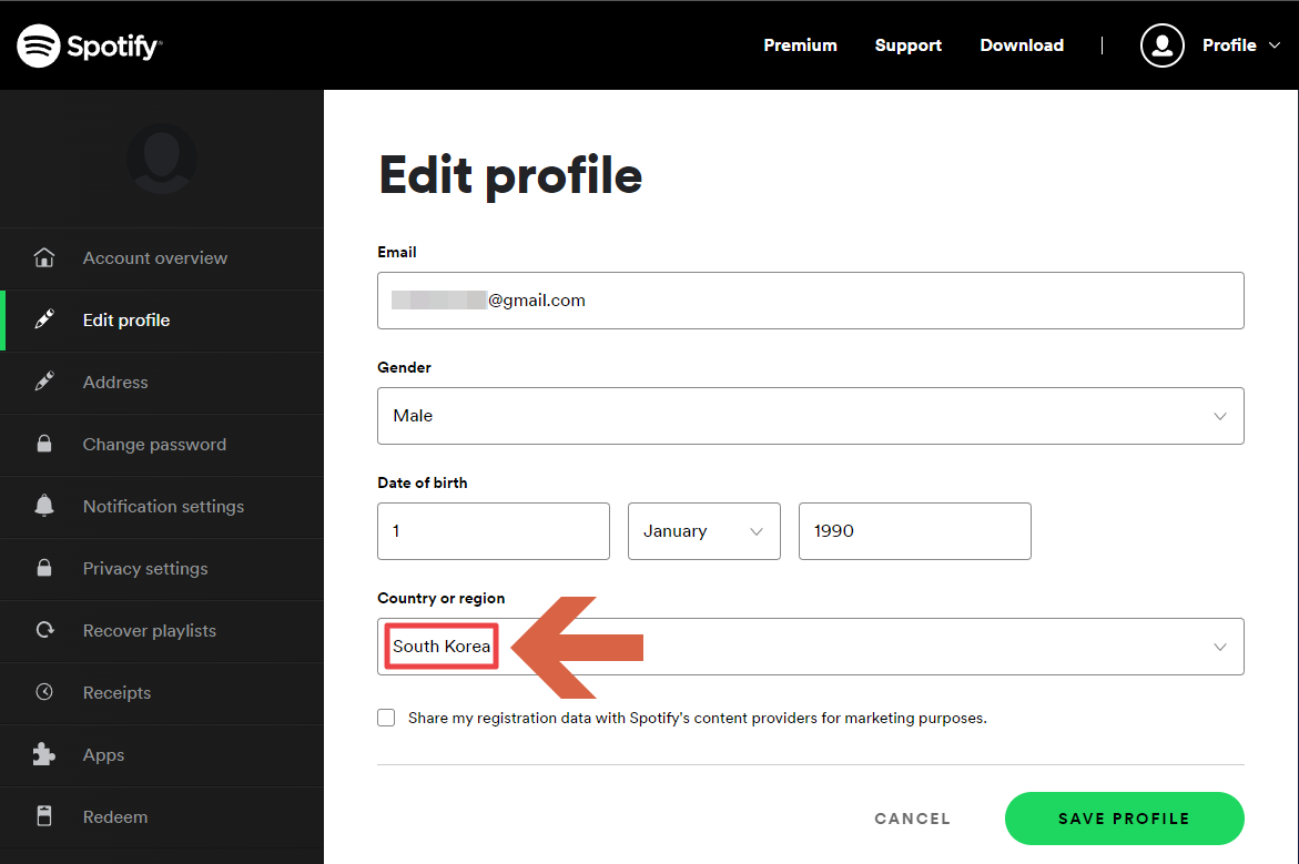 그럼 이제 계정의 국적을 바꿔봅시다. 위 링크를 클릭해 호주 스포티파이 사이트로 들어가 주세요. (만약 정상적으로 들어가지지 않는다면 아래를 참고해서 VPN을 켜고 들어가주세요ㅠㅠ) 그리고 로그인 후에 오른쪽 위에 Profile을 눌러주세요. 그리고 Account를 클릭해주세요.