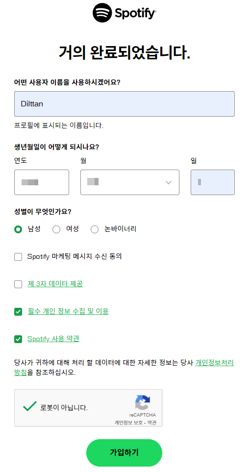 맨 아래 필수 개인 정보 수집 및 이용과 Spotify 사용 약관을 체크하시면 가입하실 수 있습니다!