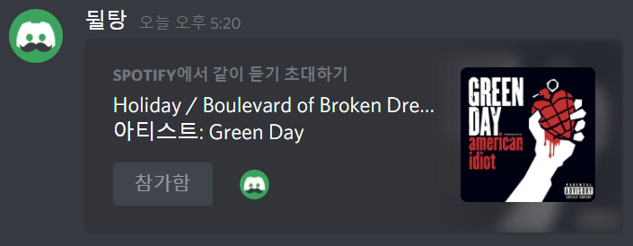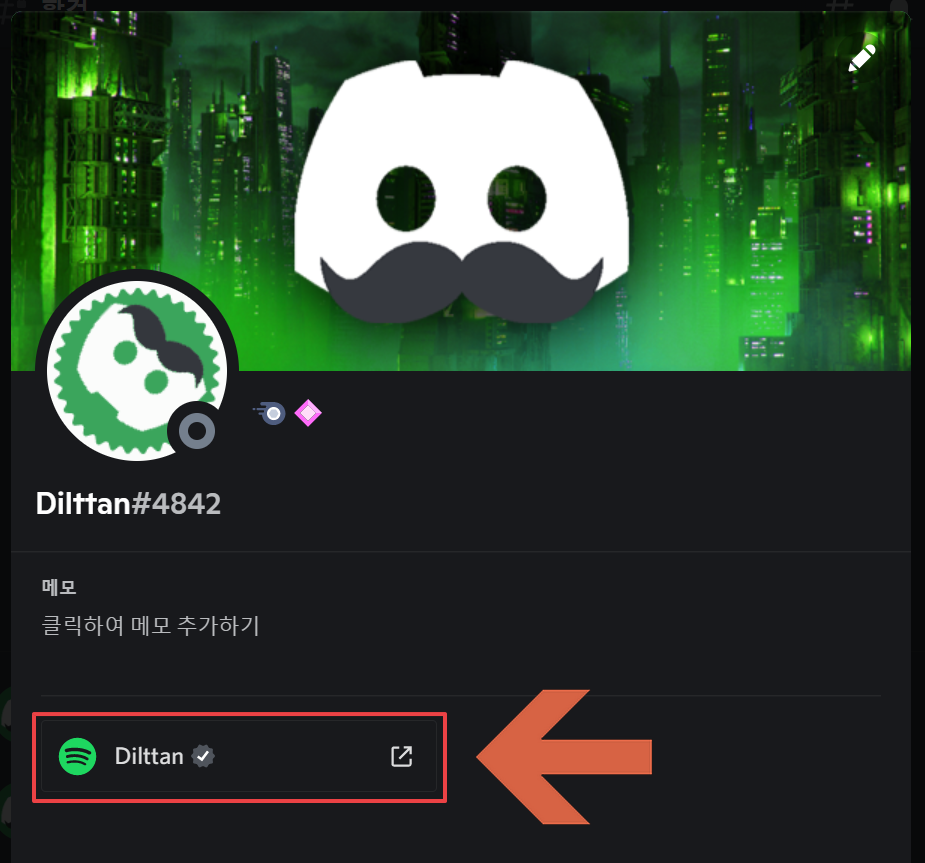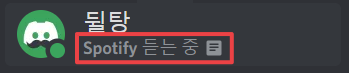 이 기능을 체크하시면 이제 사용자 상태에 Spotify 듣는 중이라 뜨게 됩니다. 사용자 상태는 내 친구들이나 같은 서버원들이 볼 수 있지요.