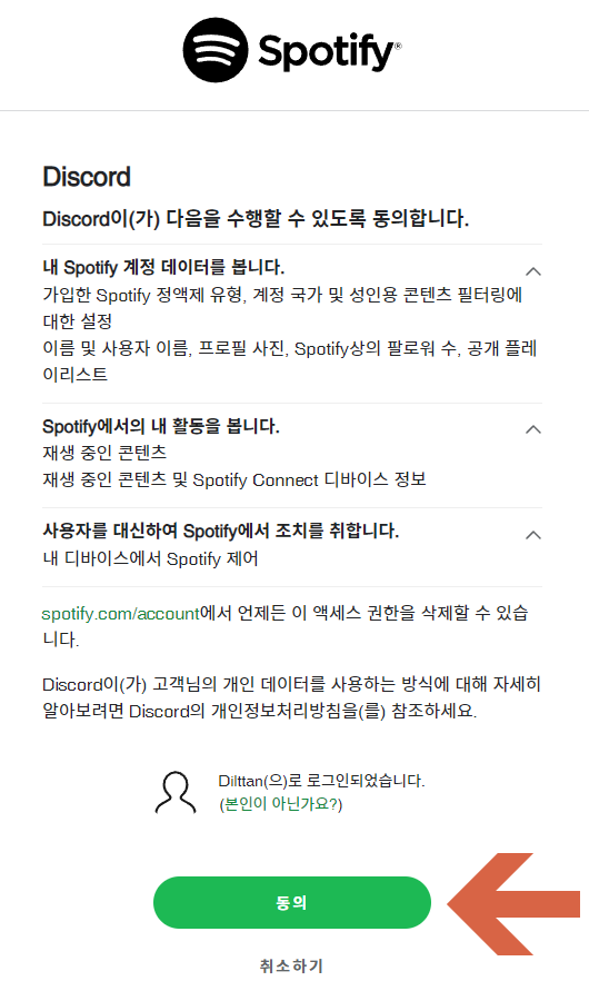 그럼 디스코드에 스포티파이 계정이 연결됐다는 안내가 뜨며 완료됩니다!