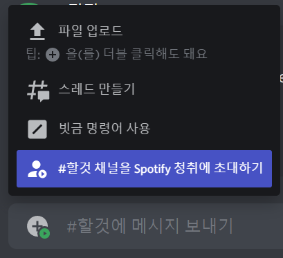 만약 다른 사람에게 같이 듣자고 요청하고 싶으시면 채팅창 왼쪽의 +를 눌러주세요. 그 후 '#채널을 Spotify 청취에 초대하기'를 눌러주세요.