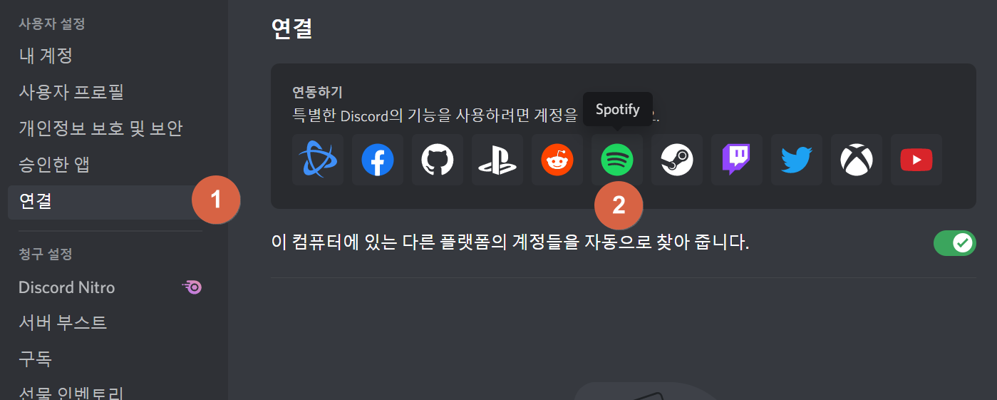 디스코드 계정으로 돌아와서 아래를 보면 다음처럼 설정 화면이 뜬 것을 확인하실 수 있습니다. 위 두 가지 설정은 계정 연결 시 쓸 수 있는 기능입니다. 오른쪽의 체크표시를 눌러 켜거나 끌 수 있어요. 그렇다면 이제 이 기능들에 대해 자세히 알아봅시다.