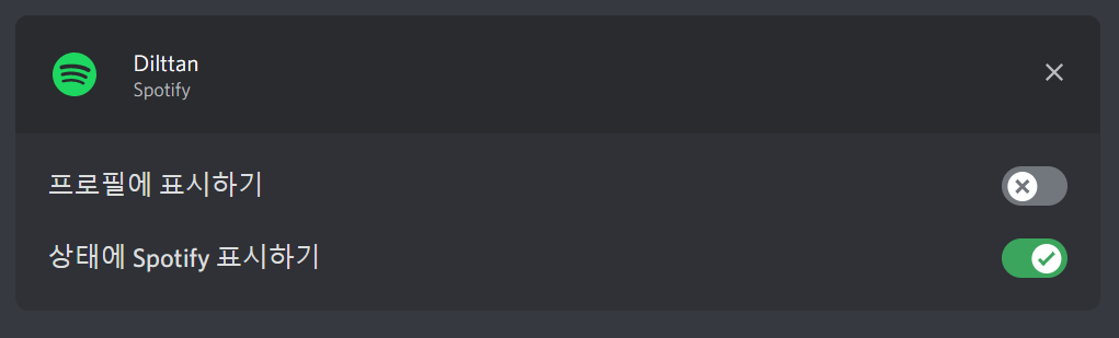 기본값으로는 꺼져있습니다. 켜시면 위 사진처럼 프로필에서 스포티파이 계정 아이디를 보실 수 있습니다. 클릭하시면 스포티파이 프로필 정보가 뜨게 됩니다.