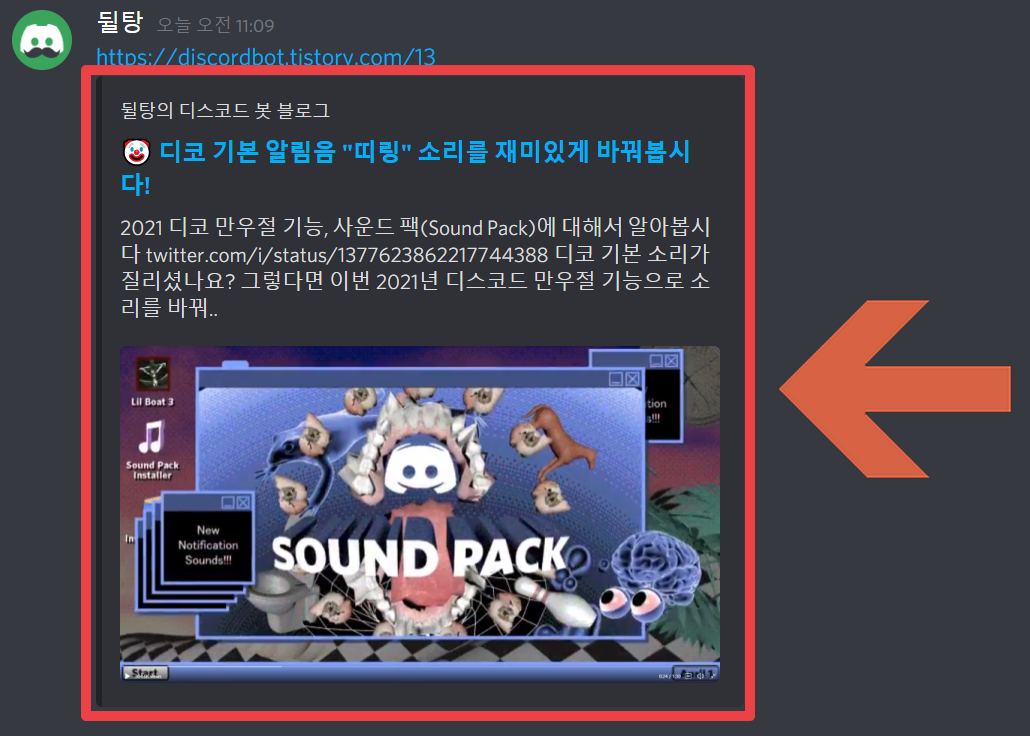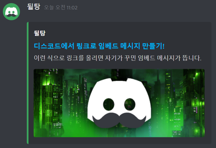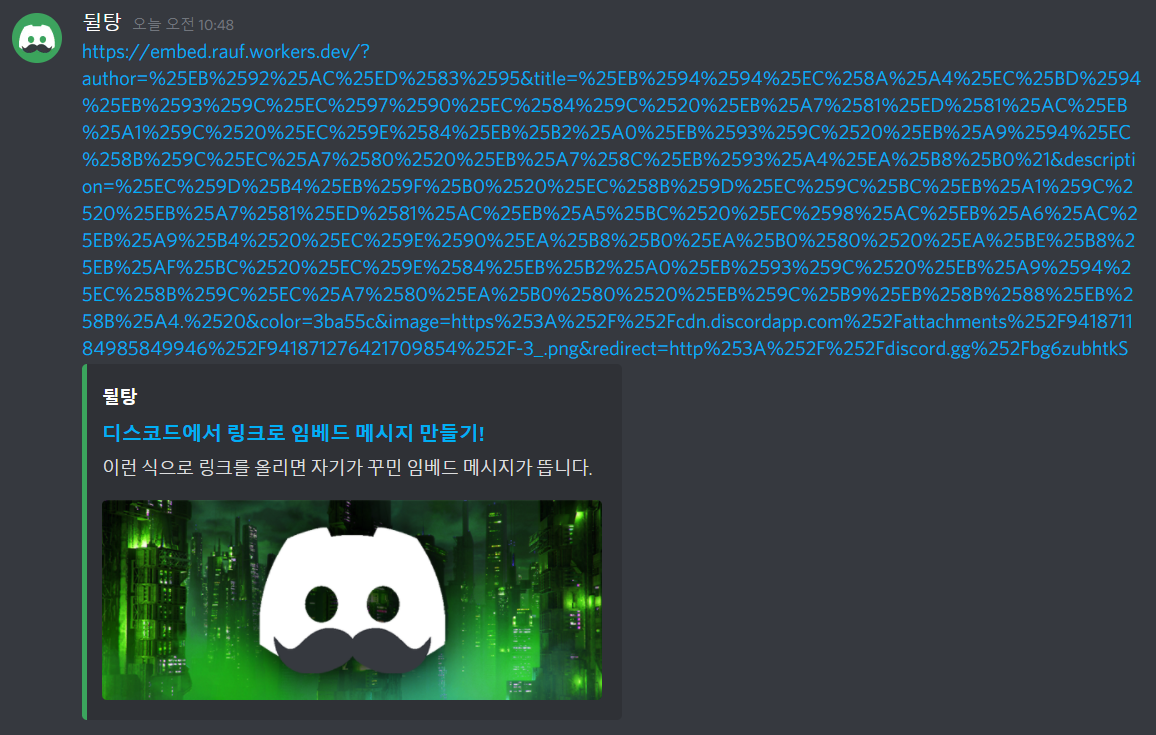 - Description : 이런 식으로 링크를 올리면 자기가 꾸민 임베드 메시지가 뜹니다.