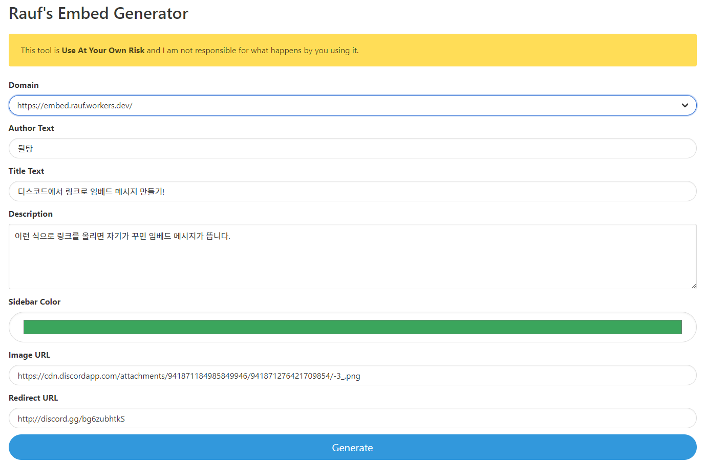 위 링크를 클릭해서 들어가 주세요. 해당 사이트가 마음대로 임베드를 만들 수 있는 사이트입니다. 위부터 원하는 대로 빈칸을 채워주시면 됩니다. 각각 항목의 뜻은 다음과 같습니다.