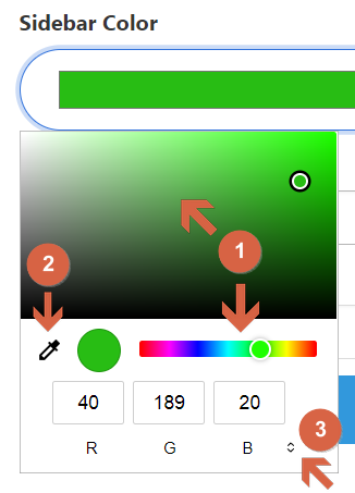 임베드 메시지에서 왼쪽에 보이는 선의 색상을 변경합니다. 좌우로 길게 이어진 검은색 선을 클릭하면 색을 변경하실 수 있습니다. 1번이 가리키는 무지개 바를 움직인 다음 팔레트에서 색을 골라주시면 됩니다. 또 2번의 피펫을 클릭해 화면에서 색을 골라 쓰실 수도 있습니다. 마지막으로 3번을 클릭해 RGB 값, HSL값, HEX 색상 코드로 색을 입력할 수도 있지요. 세 가지 방법 중 하나를 마음대로 골라 색상을 입력해주시면 됩니다! 색상 코드에 대한 자세한 설명은 아래를 봐주세요.