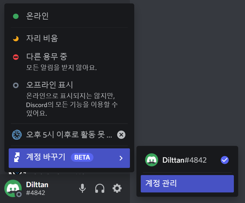 하지만 이번에 계정 전환 기능이 업데이트됨에 따라 계정들을 미리 등록해두고 쉽게 한 계정에서 다른 계정으로 바꿀 수 있게 되었습니다! (아직 베타 기능이긴 하지만요.) 디스코드 본 계정과 부계정을 번갈아가며 써보세요.