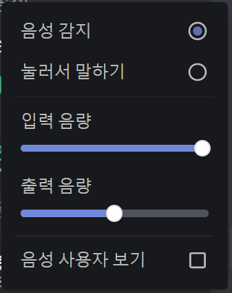 음성 감지 / 눌러서 말하기 : 말할 때 자동으로 마이크가 켜질지, 아니면 특정한 버튼을 눌러서 마이크를 수동으로 켤지를 정할 수 있습니다. 보통은 음성 감지로 두는 편입니다. 눌러서 말하기를 했을 때 어떤 버튼을 누를지는 사용자 설정 > 음성 및 비디오에서 설정합니다.
