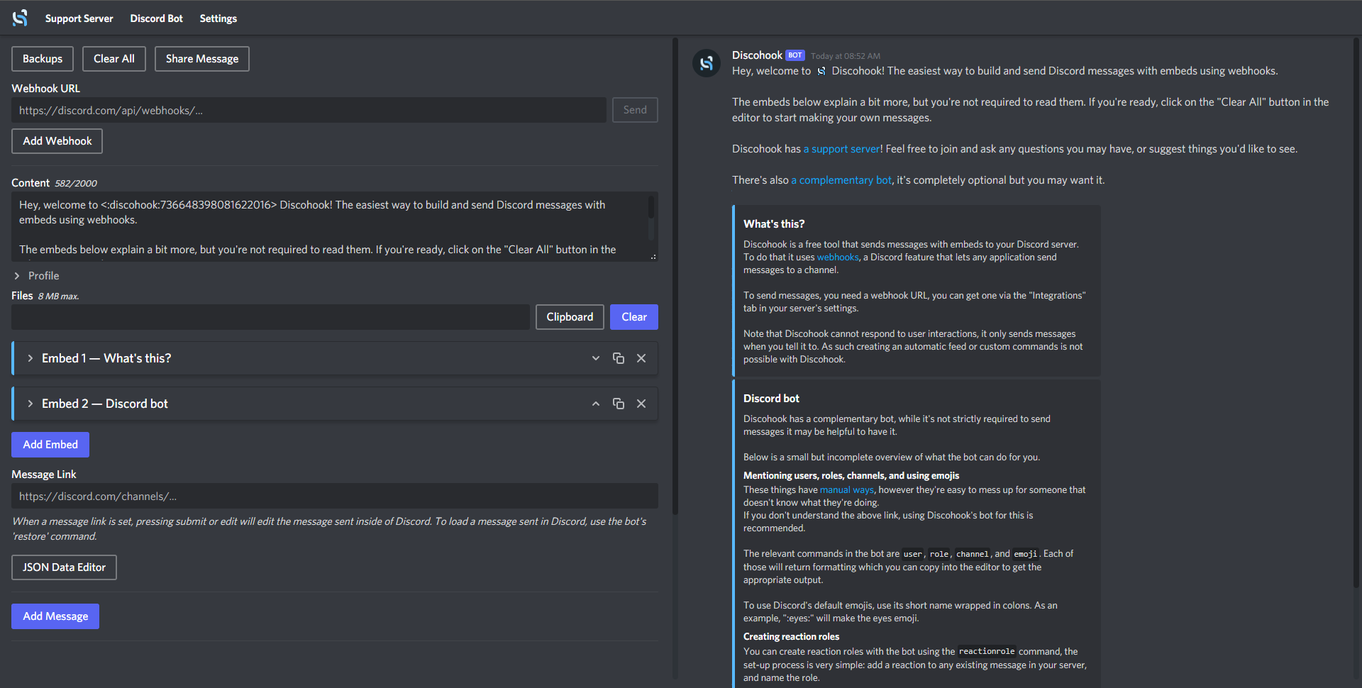 디스코훅(Discohook)은 디스코드의 웹 훅 주소로 내 마음대로 메시지를 꾸며 보낼 수 있는 사이트입니다. 텍스트뿐만이 아니라 사진이나 동영상, 파일, 임베드 메시지도 전송 가능합니다. 웹 훅 메시지의 프로필 사진이나 이름을 바꿔줄 수도 있고요. 그리고 이렇게 설정한 메시지를 저장해 다시 불러와 똑같이 메시지를 보내는 것도 가능합니다.
