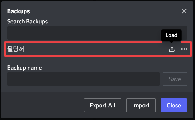 그럼 다음과 같이 메시지 설정이 저장됩니다! 옆의 Load 버튼을 눌러 이 설정을 불러올 수 있습니다. 가장 왼쪽의 점 3개를 눌러 해당 설정을 파일로 저장하거나, 덮어쓰거나, 삭제할 수 있습니다.