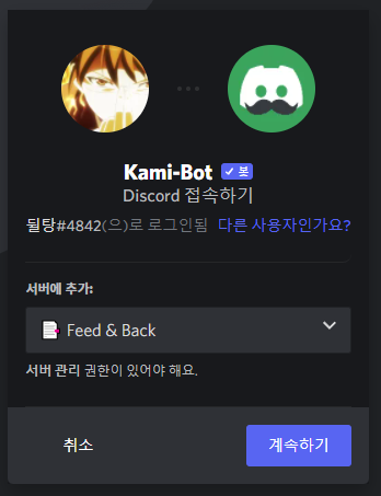 카미봇 서버에 초대하기
