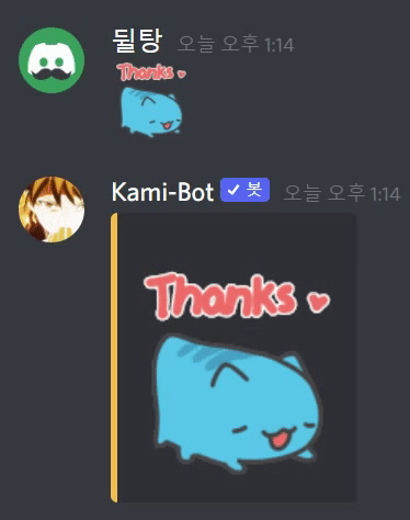 또 위처럼 움직이는 이모티콘도 변환이 가능합니다. 위 이모티콘처럼 안에 글자가 있을 경우 이 봇을 이용하면 선명하게 글자를 볼 수 있겠지요!