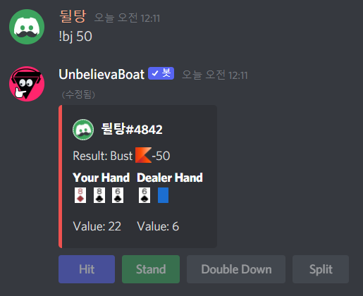 두 번쨰는 블랙잭 게임을 하는 것입니다. 블랙잭 게임은 UnbelievaBoat을 통해 이루어집니다. 여기서 딴 돈 10,000원 당 경험치 1,000으로 환전해줍니다. 기초 자금은 !work 명령어와 !crime 명령어로 얻으실 수 있습니다.