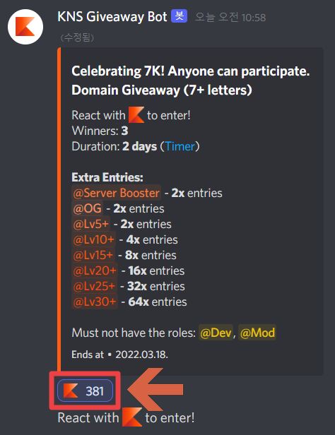 가끔씩 #🎁 giveaway 채널에서 도메인을 뿌리기도 합니다! 기브어웨이는 아래 반응을 누르시면 참가하실 수 있습니다. 레벨이 높을수록 기브어웨이 당첨 확률이 올라갑니다. 레벨이 30일 경우는 남들보다 당첨확률이 64배 높다 합니다!