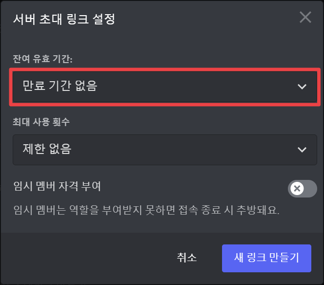 서버 초대 링크 설정창이 뜨면 잔여 유효기간 설정을 만료 기간 없음으로 설정해줍니다. 그리고 새 링크 만들기를 눌러줍시다.