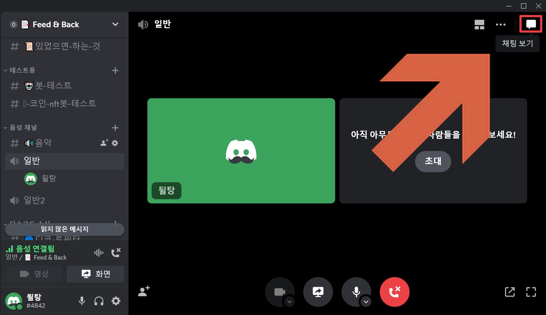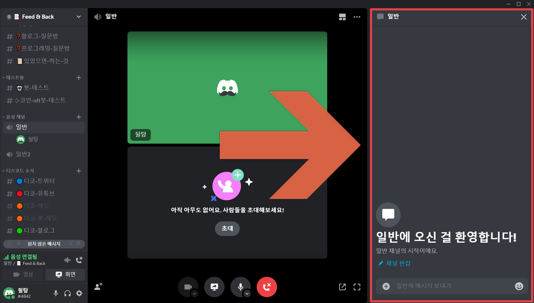 음성 채널 채팅은 스레드처럼 오른쪽에 따로 뜨게 됩니다!