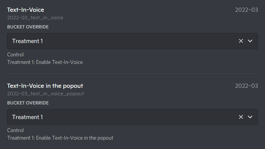 그 후 Experiments에 들어가 검색창에 Text-In-Voice라고 검색해주세요. 그리고 둘 다 Treatment 1을 선택해주시면 됩니다!