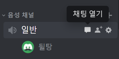 해당 음성 채널의 채팅에 들어가려면 우선 마우스를 위에 올려주세요. 그러면 오른쪽에 말풍선 모양 아이콘(💬)이 뜹니다. 이를 클릭하면 채팅이 열어집니다.