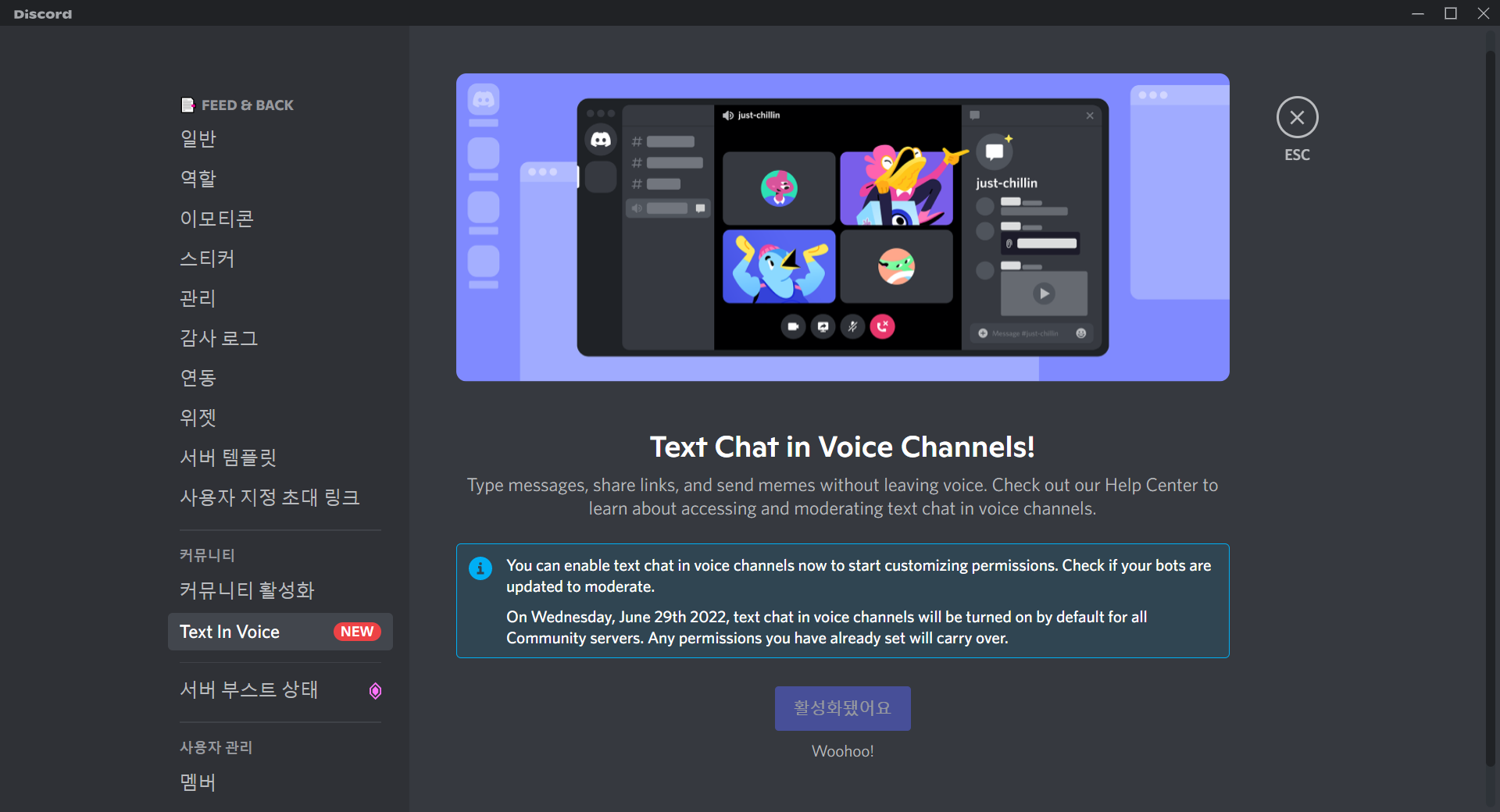 이번에 새로 업데이트되어 디스코드 음성 채널에 채팅이 추가되었습니다! 이제 음성 채널마다 따로 채팅 채널을 만들어줄 필요가 없습니다!