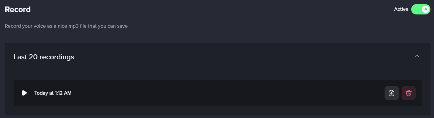 MEE6 대쉬보드에서 최근 녹음된 파일 20개를 보실 수 있습니다. 왼쪽에는 언제 녹음했는지 일시가 뜹니다. 오른쪽에는 버튼이 있으며 누르면 녹음 파일을 다운로드 받거나 삭제하실 수 있습니다.