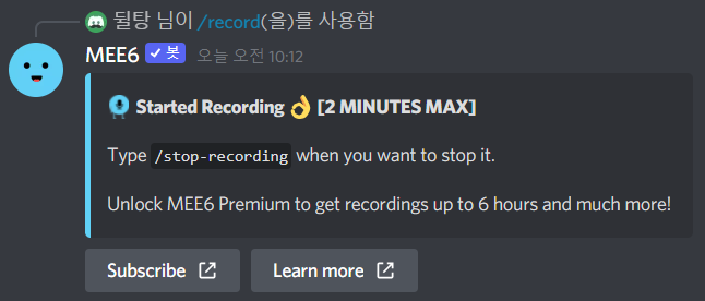 그럼 다음과 같이 MEE6 봇이 해당 음성 채널로 들어옵니다. 그리고 녹음를 하기 시작합니다. 녹음는 무료 버전에서는 최대 2분까지만 가능합니다.