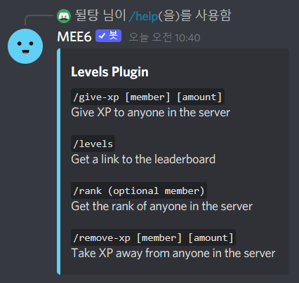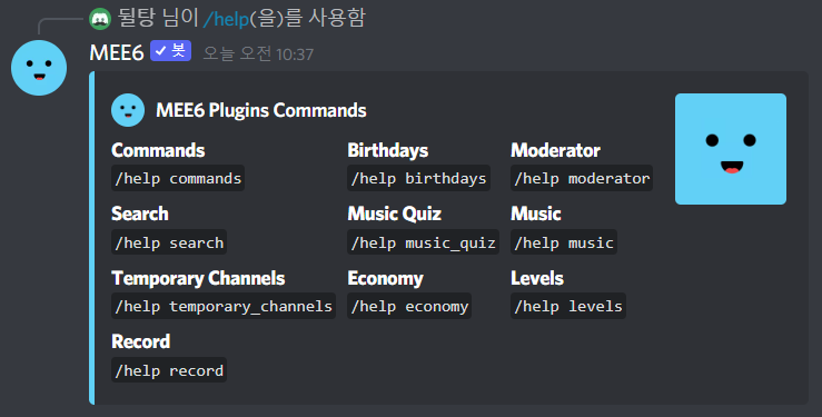 현재 어떤 MEE6 명령어가 활성화되어있는지 보여줍니다. 그냥 /help만 단독으로 입력하면 어떤 플러그인이 활성화되어 있는지 보여줍니다.