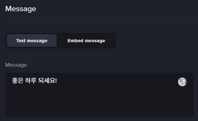 보내지는 메시지의 내용을 설정합니다. 위에 Text message를 고르면 일반 메시지로, Embed message를 고르면 임베드 메시지로 보냅니다. 메시지에는 마크다운, 커스텀 커맨드 변수, 메시지포메팅을 쓰실 수 있습니다. 임베드 메시지 설정에 대해서는 아래 글을 살펴봐주세요.