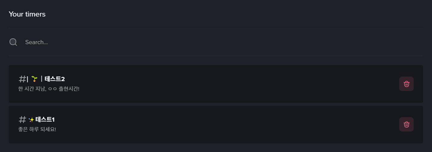 모든 타이머는 대쉬보드에서 위처럼 보실 수 있습니다. 오른쪽의 휴지통 모양 아이콘을 누르면 삭제하실 수 있습니다.