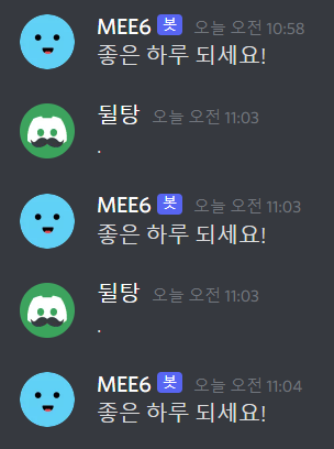 그리고 타이머 메시지로 도배되는 것을 막기 위해 채널에 새로운 메시지가 올라오지 않을 경우 타이머 메시지를 보내지 않습니다. 위 예시는 타이머 주기를 1분으로 설정해놓은 경우입니다. 맨 위 10시 58분에 메시지를 보내고 새 메시지가 없으니 보내지 않다가, 11시 3분에 새 메시지가 올라오자 다시 타이머 메시지를 보내는 모습입니다.