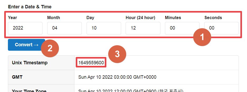 그리고 Enter a Date & Time 아래에 시간을 입력해줍니다. 그 다음 Convert 버튼을 눌러주세요. 그러면 아래쪽 3번 위치에 숫자가 뜨는데, 이게 바로 유닉스 시간입니다! 이것을 메모장에 복사해주세요.