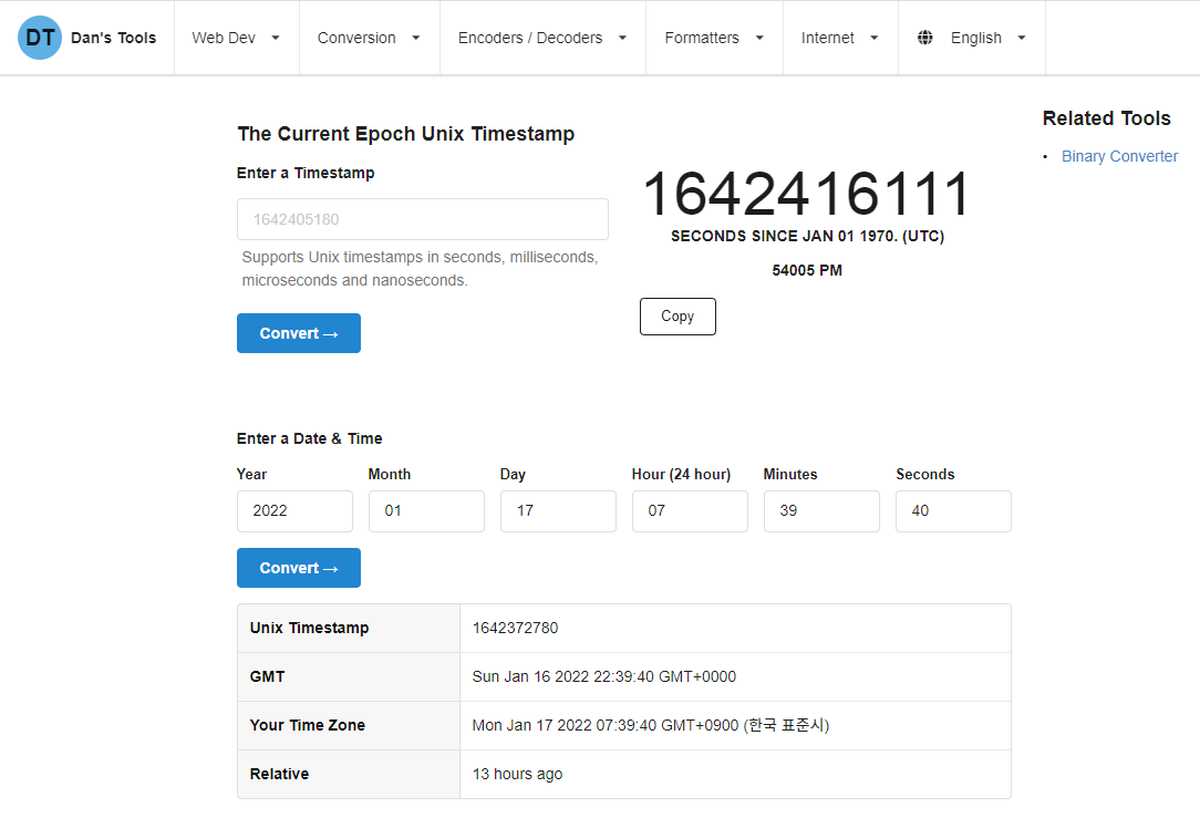 유닉스 시간은 시간을 표현하는 숫자입니다. 유닉스 시간을 구하려면 우선 위 사이트로 들어가주세요.