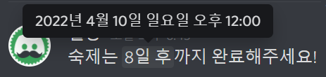 또 채팅에서도 위와 같이 시간 표시를 해줄 수 있습니다! 시간 기한을 표시할 때 좋겠지요.