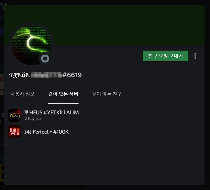 그 후 다음과 같이 크게 프로필이 뜨면 같이 있는 서버 탭을 눌러서 나랑 그 사람이 어느 서버에 같이 들어가있는지 확인해주세요. 만약 내가 초대한 서버에 그 사람이 들어와있지 않다면, 그 사람이 초대한 서버에서 나와주시면 됩니다. j4j라 해놓고 정작 상대방 서버에는 들어가지 않아서 다른 사람이 자신의 서버에 들어오도록만 하는 경우가 있으니 꼭 상대방이 내 서버에 들어왔는지 확인해주세요.