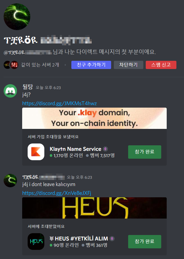개인 DM하는 창이 뜨면 여기서 내 초대 링크를 올리고, 상대방의 초대 링크가 올라오기를 기다려줍니다. 그리고 상대방의 서버에 들어가주시면 됩니다.