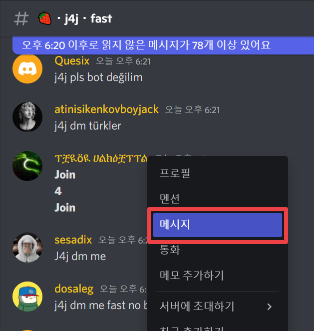서버에 들어오면 다음처럼 사람들이 j4j라고 계속 말하는 채널이 있을겁니다. 여기서 아무 사람한테 DM을 보내주시면 됩니다. DM을 보내는 대화창은 이름에 우클릭을 하고 메시지를 누르면 보실 수 있습니다. 혹은 내가 j4j라 적고 다른 사람을 기다려도 됩니다.