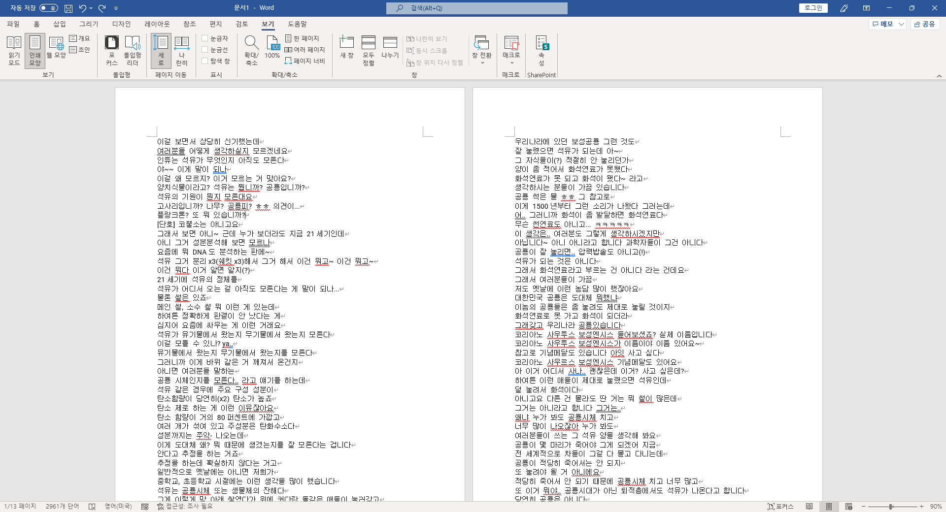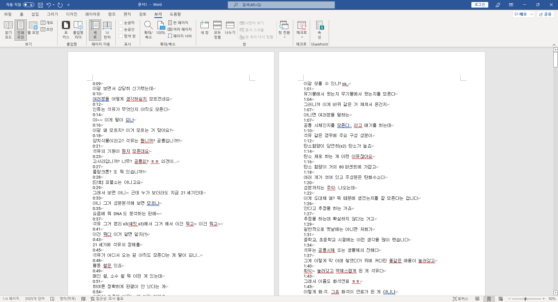 워드에서 아까 복사한 유튜브 스크립트를 붙여 넣어주시면 위처럼 보이게 됩니다. 홀수번째 줄마다 시간 표기가 있는 게 눈에 뜨이죠. 이 표기를 지우시고 싶으시면 아래 메크로 코드를 복사해 실행해주시면 됩니다.
