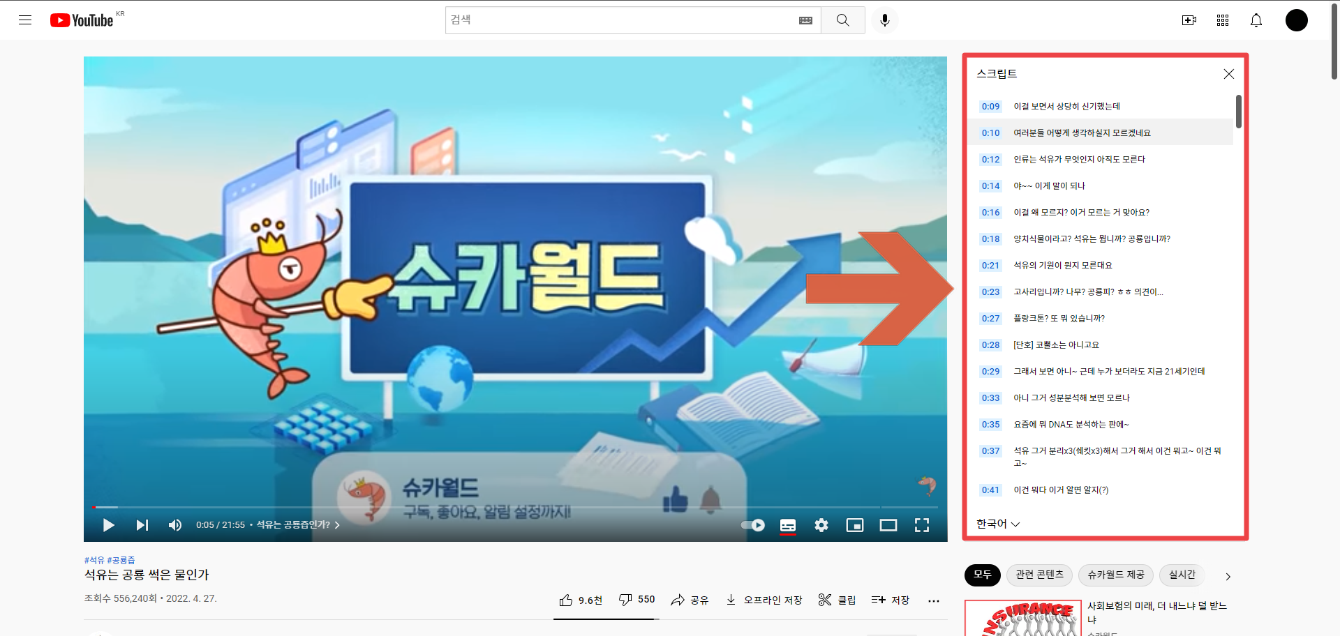 그럼 다음과 같이 오른쪽에 해당 동영상의 전체 스크립트가 뜨게 됩니다. 이걸 복사하셔서 쓰시면 됩니다. 하지만 그냥 쓰시면 시간 표시가 같이 포함되므로, 워드에서 시간 표시를 삭제해주시면 됩니다.