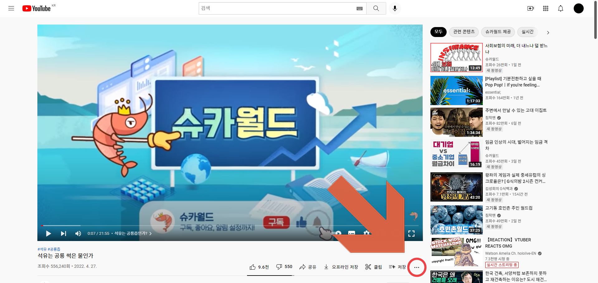 유튜브에서는 스크립트(자막)을 모아서 볼 수 있는 기능이 있습니다. 만약 동영상 개시자가 자막을 올려놓지 않았다 하더라도, 자동으로 음성 인식을 해서 자막을 만들어줍니다. 스크립트를 보시려면 우선 동영상 제목 기준 맨 오른쪽에 있는 점 3개(…)를 클릭해줍니다.