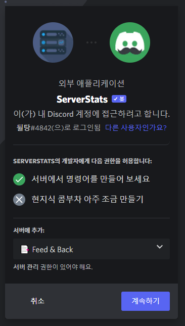 그 다음 위 창이 뜨면 봇을 추가하고픈 서버를 선택해주시면 됩니다. 봇을 추가하는 게 익숙지 않으신 분들은 아래 글을 참고해주세요.