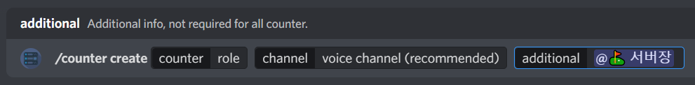 우선 /counter create를 입력해준 다음 counter에는 role이라고 입력해줍니다. 그리고 channel은 voice channel로 해줍니다. 마지막으로 확인해볼 역할은 additional에 추가해주시면 됩니다.