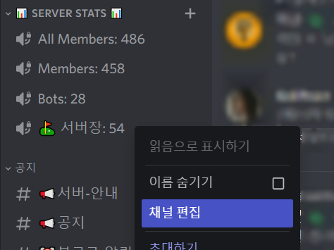 카운터 채널은 보여지는 문구 형식을 자유롭게 바꿔줄 수도 있습니다. 특별한 명령어 필요 없이요. 카운터 채널을 수정하고프면 바꾸고픈 채널에 우클릭을 한 다음 채널 편집을 눌러주세요.