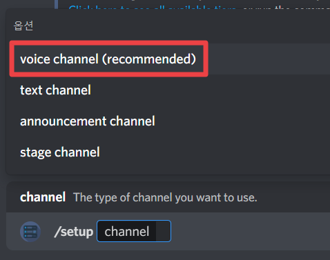 서버 스탯봇은 간단하게 /setup이라 입력해주신 다음 뒤에 원하는 채널 종류를 골라주시면 됩니다. 서버 스탯 봇에서는 음성 채널 형태(voice channel)로 만드는 것을 추천하고 있습니다.