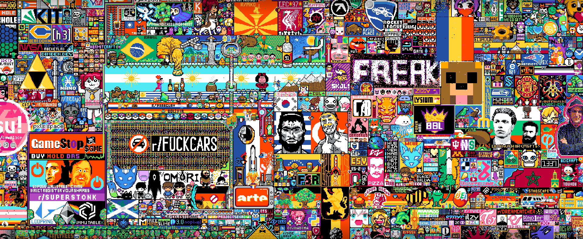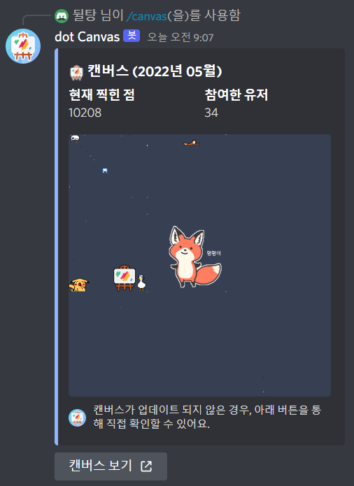 레딧에서 만우절을 기념해서 r/place라는 전 세계인의 그림판을 만든 적이 있습니다. 우리나라 태극기도 작게나마 여기에 그려졌었죠. 닷 캠버스 봇도 이와 비슷한 방식으로 동작한다 보시면 됩니다!