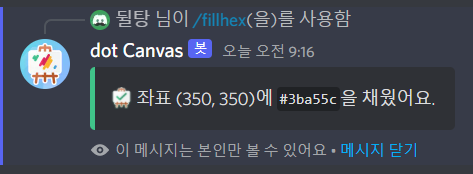 닷 캠버스(dot Canvas) 봇은 해당 봇을 사용하는 모두에게 공유되는 그림판에 낙서를 할 수 있는 봇입니다! 전체 그림판에서 점을 찍고 싶은 좌표와 색깔을 입력하면 해당 위치에 점이 찍히는 방식입니다. 계속 점을 찍어 나만의 그림을 그려볼 수 있겠죠!