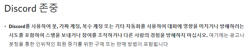 첫 번째는 디스코드 커뮤니티 가이드라인 위반이라는 점입니다. 디스코드에서는 자동화를 이용하여 다른 사람들의 대화에 악영향을 미치는 것을 싫어합니다. 여기에는 메크로도 포함이겠지요. 디스코드 가이드라인 위반이 적발되면 디스코드 계정이 정지될 수 있습니다.
