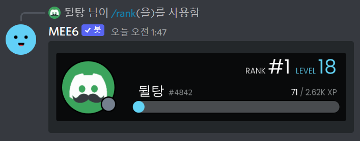 그리고 그런 봇에서는 위처럼 명령어를 쳐서 정보를 보는 기능이 있는 경우가 많습니다. 예를 들어 MEE6 봇의 경우에는 /rank 명령어를 치면 나나 다른 사람들의 레벨과 경험치를 볼 수 있지요. /leaderboard를 치면 현재 서버 유저들의 레벨 순위를 볼 수 있습니다.